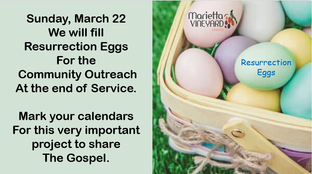 Join us on Sunday 3/22 as we worship and fill some “resurrection Eggs” for our Community Outreach at the Inn Town Suites on Palm Sunday. See y’all Sunday.
